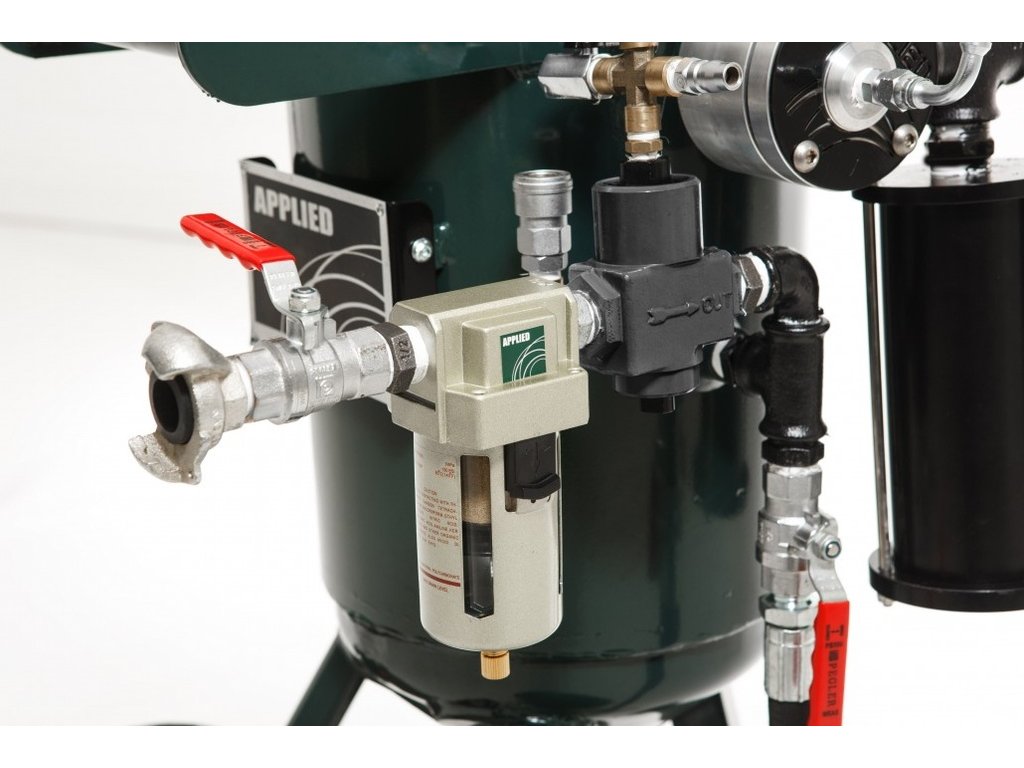 Applied 20 je vhodný především pro tryskání menších ploch, nenáročné údržbové práce a na pískování skla – kapacita zásobníku je totiž 20 litrů a délka tryskání je okolo 10 minut. Vyrobený z těžké oceli.