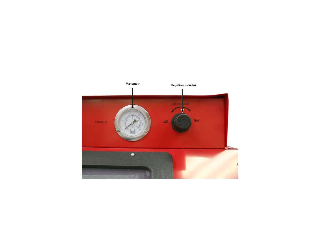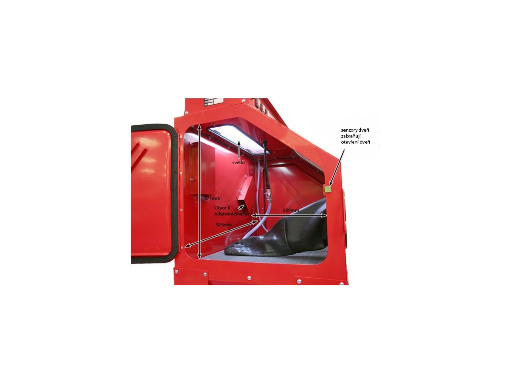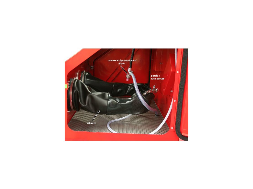 - 1 stacionární tryska uvnitř kabiny, pro ovládání tryskacího procesu nohou, umožňuje držet tryskaný předmět 2 rukama