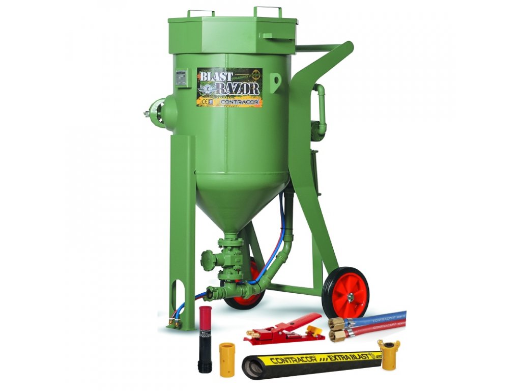 Kompletní tryskací set obsahuje nejen mobilní pískovací zařízení BlastRazor Z-100 RCS o objemu nádrže 100 litrů s dálkovým ovládáním procesu tryskání, ale také hadici dálkového ovládání, hadici na pískování (obě v délce 20 metrů), rychlospojku, držák trysky a vysoce odolnou trysku s vnitřním průměrem 6,5 mm. Set dodáváme se směšovacím ventilem SVG pro těžká a agresivní abraziva.